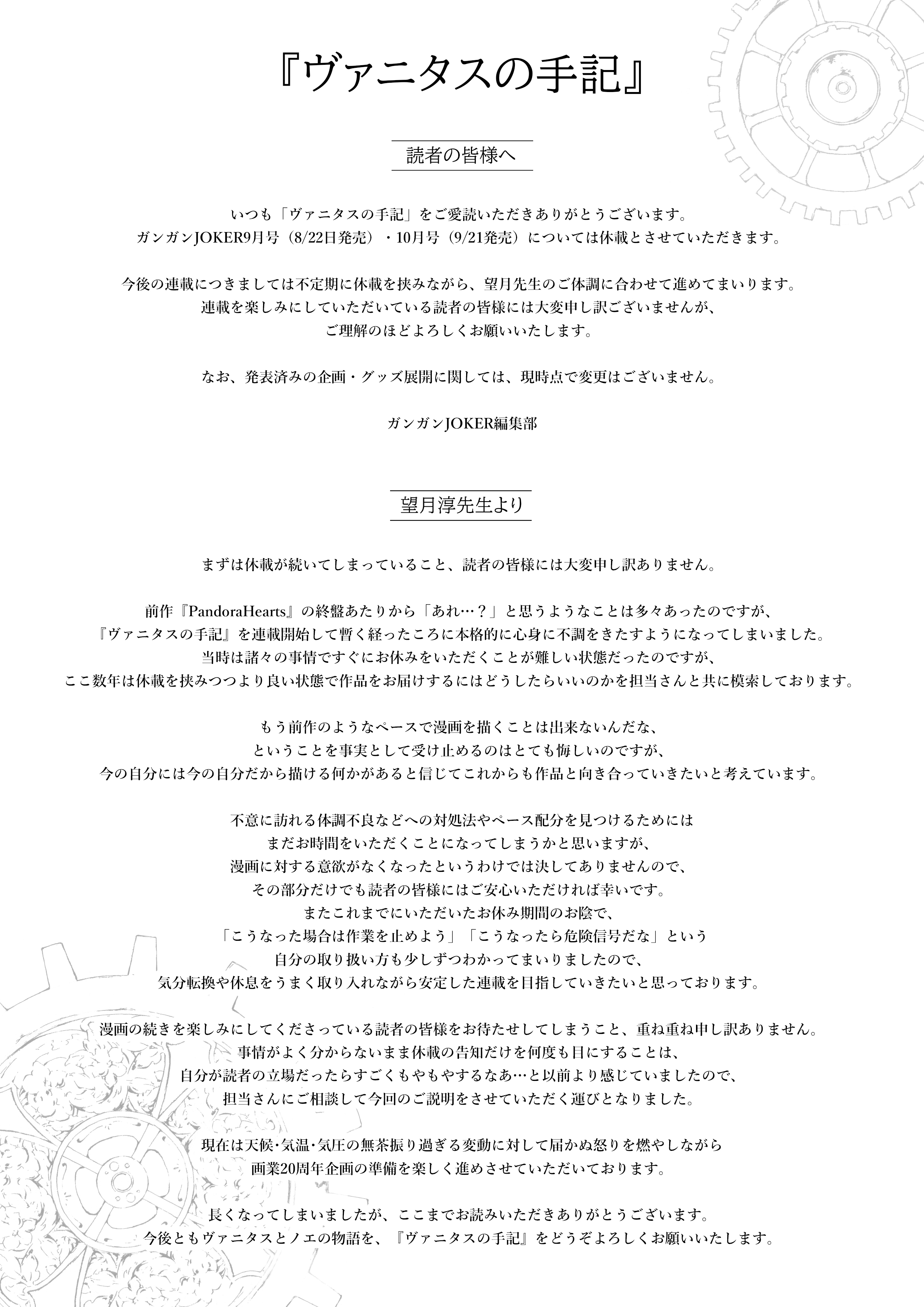 The next phase visibly has half the number of pages per Mémoire, and with many more hiatuses than before. This era takes place from 7/22/2017 to 3/22/2022. From Mémoire 57 onward the schedule collapses. The manga goes on a hiatus in May 2022, only to return in the following year on the same month. In the meantime Gangan Joker's Twitter account uploads a message on 8/22/2024 regarding Vanitas that includes a message from Mochizuki. The basic meaning of the message is that the hiatuses are the result of physical and mental problems, and that she is discovering how to work while also taking breaks.