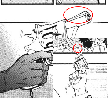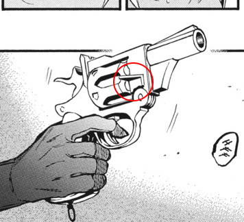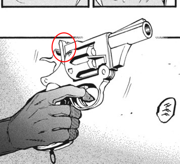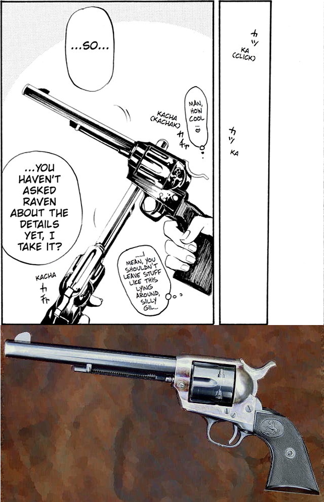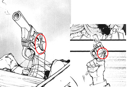 So what does this mean? Is it a Pandora Hearts reference? The recycling of a pistol design that she already knew how to draw? Her deciding to draw a gun that she knew looked really cool and was manufactured at the right time to fit the setting? It’s a mystery. But we do know one thing.