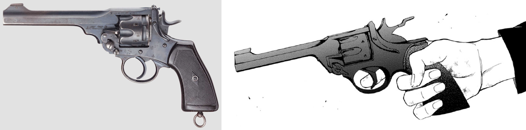 My initial theory was that it was some kind of French service revolver. However, while searching online for famous models from the time period, it became clear that Dante’s gun had an unusual combination of traits that kept it from fully resembling the various revolvers I compared it to. These traits included strange winglike projections on the sides of the gun that sat just in front of the cylinder, a high rear sight, and a long cylinder release lever on the left side of the gun. There was lastly a kind of retcon done back in volume 1: early on it had a half-moon sight, but in later appearances it took on a more modern-looking blade sight. But the half-moon sight from the very first clear look at the gun was the key toward finding the correct model. Before that retcon it was probably a faithful reproduction of the gun. I had seen this revolver before, I began to realize. Not many guns from this period had this many curiously shaped metal pieces on its surface. Neither did many guns have those metal holster guides, as I later learned the metal flaps were. In the end, it was no other than a snub nose version of the Webley Mk. I. Dante wasn’t using a French gun, he was using the British service revolver!